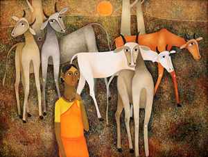 “Rustic Rhapsody,” a solo exhibition of the captivating works by the renowned artist, Mohan Naik. Mohan Naik’s art is a vivid portrayal of rustic Indian life, skillfully combining figurative aesthetics with the timeless theme of human association with livestock. His works resonate with a nostalgic charm, capturing the essence of village life that is slowly vanishing in our ever-developing world.