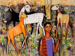 The artist’s choice of pastel and warm colors, meticulously balanced across the canvas, mirrors the natural color palette of the Indian village. His paintings don’t just depict livestock like goats and cows; they symbolize the intimate companionship that these animals provide to the people of these rustic spaces. Mohan Naik’s art effortlessly captures the deep bond between man and beast.